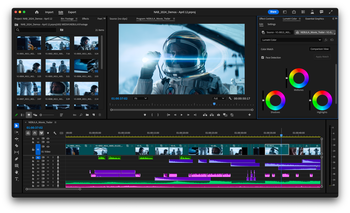 Professional software—primarily Adobe Premiere Pro, After Effects, and Audition—with exports via Media Encoder.